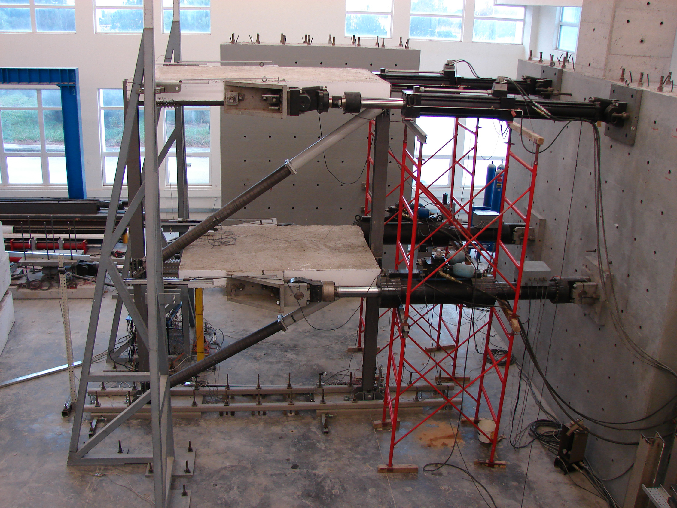 The project studied the cyclic lateral load response of a 2:3-scale three-storey, one-by-two-bay, strong beam-weak column RC frame, focusing on the effects of the column’s smooth bars and of their detailing on local and global behaviour. Slippage of bars caused concentration of column deformations in flexural cracks at the top and base sections and gave to the global hysteresis loops a shape typical of bond-slip behaviour, but without cyclic strength decay.